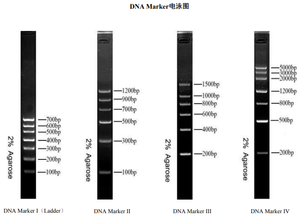 4. DNA Marker IV:由DNA片段5000bp、3000bp、2000bp、1200bp、800bp以及200bp構成,其中1200bp、 500bp為100ng,其余條帶DNA量約為50ng。